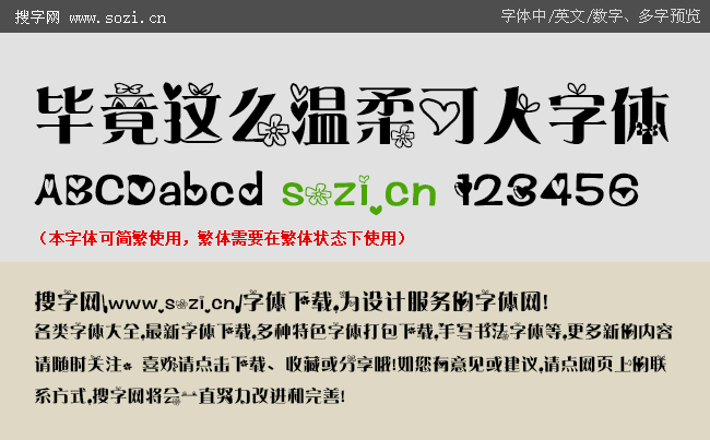 搜字網所有字體源于網絡分享,免費供大家學習交流。除有廠商申明可免費商用以外,都僅限個人非商業(yè)使用。未獲字體開發(fā)方商用授權的,嚴禁擅自商用,因此造成的侵權責任須自行承擔。本站不承擔任何版權責任和糾紛,本站出于愛好而建,善意免費為各類字體開發(fā)者宣傳推廣,您認為有任何不妥之處,請與我們聯系,將會第一時間給您答復!
