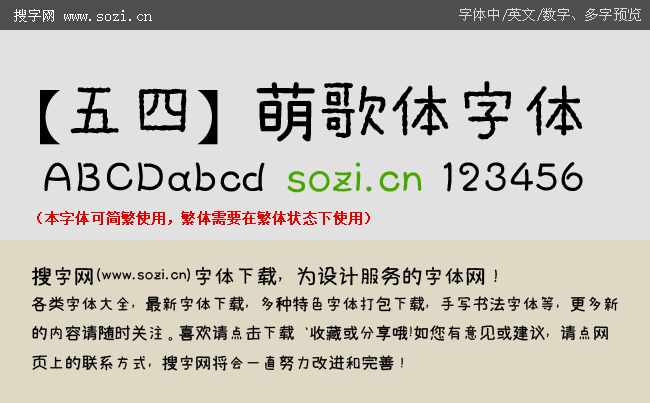 搜字網(wǎng)給大家提供一款卡通手寫風格的手機中文字體下載。名字叫萌歌體字體,這款手機字體是仿照兒童手寫風格的卡通手寫字體,結(jié)構(gòu)帶有POP字體風格,特別適合喜歡卡通的朋友在手機上安裝使用。
